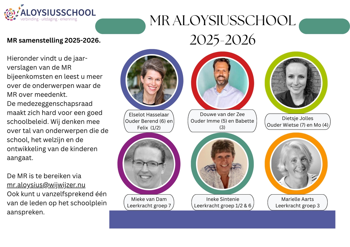 Mocht u vragen hebben, of onderwerpen die besproken moeten worden dan kunt u de MR bereiken via ons e-mailadres (mr.aloysius@wijwijzer.nu). Natuurlijk kunt u ook één van ons aanspreken op het schoolplein.